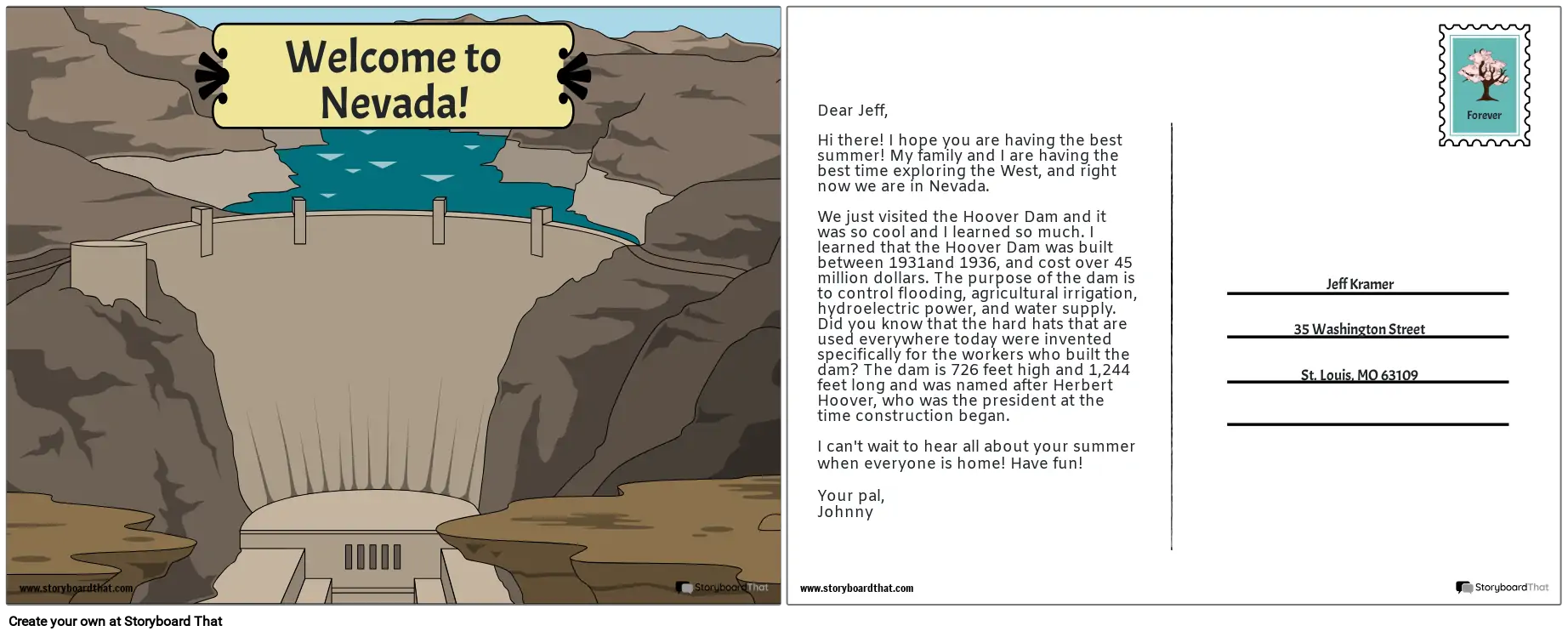 בנבאדה יש כל כך הרבה מקומות נפלאים לבקר בהם, וגלויות הן דרך מהנה ליידע אחרים על היכן היית! באמצעות תבנית הפוסטר של 2 תאים שסופקה, התלמידים ייצרו גלויה מנבאדה . החלק הכתוב חייב לכלול לפחות עובדה אחת על ציון הדרך, והתמונה חייבת לתאר במדויק את המיקום. כמה דוגמאות לאטרקציות תיירותיות בנבאדה הן סכר הובר, אגם טאהו, לאס וגאס, אזור הבילוי הלאומי לייק מיד והפארק הלאומי הגדול באגן.