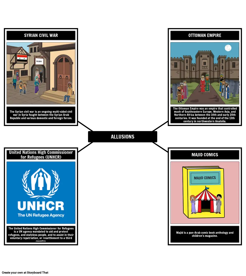 Welcome to Nowhere includes allusions to real-world events and organizations such as the Syrian Civil War, the Ottoman Empire, and the United Nations High Commissioner for Refugees (UNHCR). It also references cultural media like Majid Comics, helping students connect literature to history and society.