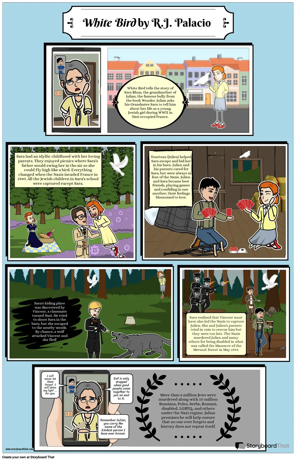 Razvoj profila likova, vizualno istraživanje važnih tema, vizualna prilagodba određenog poglavlja ili scene ili čak izrada grafičke knjige koja razrađuje određenu točku radnje neke su od projektnih mogućnosti. Učenici mogu dodatno upotrijebiti svoju maštu kako bi dodali priču i stvorili vlastitu verziju Bijele ptice, a da središnje teme ostanu iste.