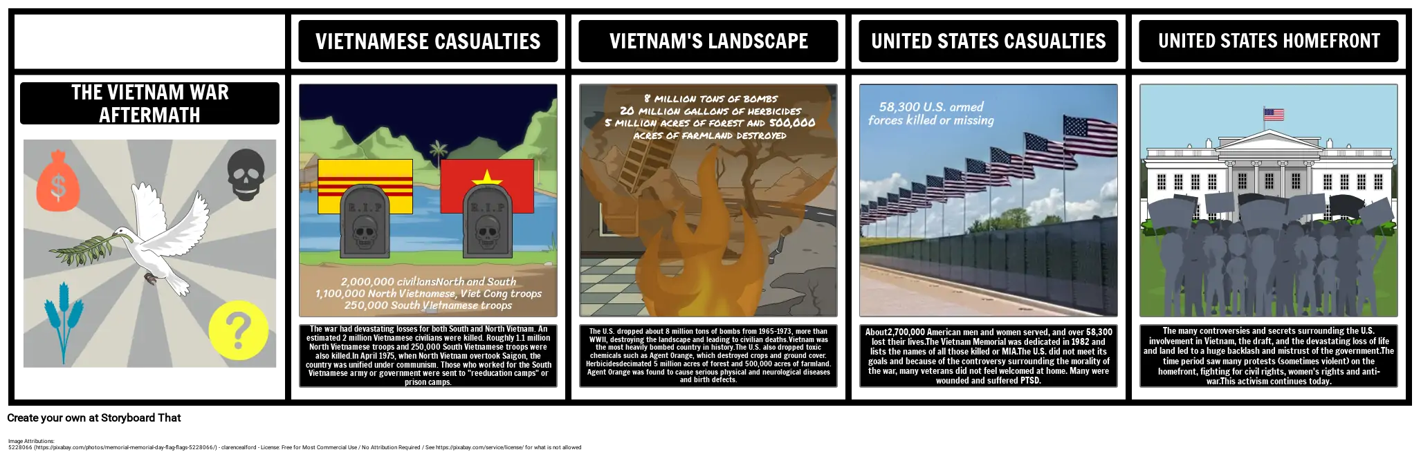 Nakon saznanja o Vijetnamskom ratu, njegovim raznolikim i kontroverznim uzrocima, kao i mnogim važnim i tragičnim događajima koji su se dogodili, učenici će izraditi ploču priča koja objašnjava posljedice rata . Kako je bilo u Vijetnamu nakon pada Sajgona? Koliki je danak bio za Vijetnamce? Na američke vojnike? Na njihove obitelji i na domaćem planu? Učenici mogu prikazati svoja otkrića u mapi pauka ili grafikonu koji ističe važne činjenice, brojke ili citate zajedno sa smislenim ilustracijama kako bi pokazali svoje razumijevanje i objasnili kraj desetljeća dugog sukoba u Vijetnamu. Učitelji također mogu zatražiti od učenika da uključe ćeliju koja analizira kako su se javni osjećaji promijenili nakon i do danas.