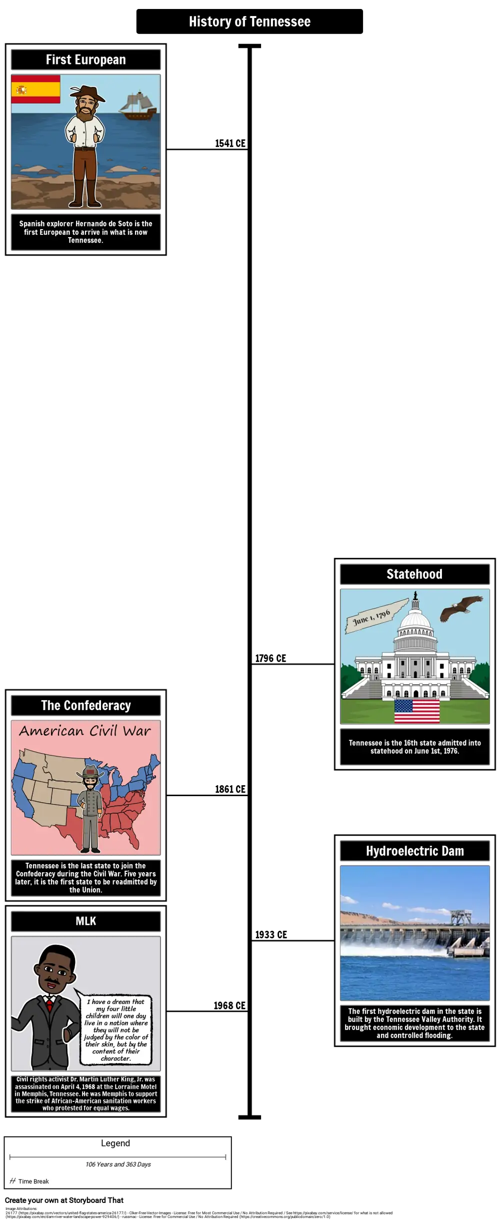 Ključni događaji za vremenski okvir povijesti Tennesseeja uključuju Hernanda de Sota istraživanje (1541), stjecanje državljanstva (1796), pridruživanje i ponovno pridruživanje Uniji tijekom Građanskog rata (1861, 1866), izgradnju prve TVA brane (1933) i ubojstvo dr. Martina Luthera Kinga Jr. u Memphisu (1968).