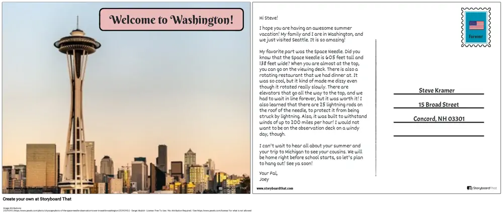 Prvo, zamolite učenike da odaberu znamenitost u Washingtonu, a zatim koristite šablonu s 2 ćoška: jednu za crtež, a drugu za kratku bilješku s činjenicom. Učenici trebaju dodati naziv države, kreativnu adresu i zabavnu marku. Ovaj pristup potiče kreativnost i jača znanje o lokalnim znamenitostima.