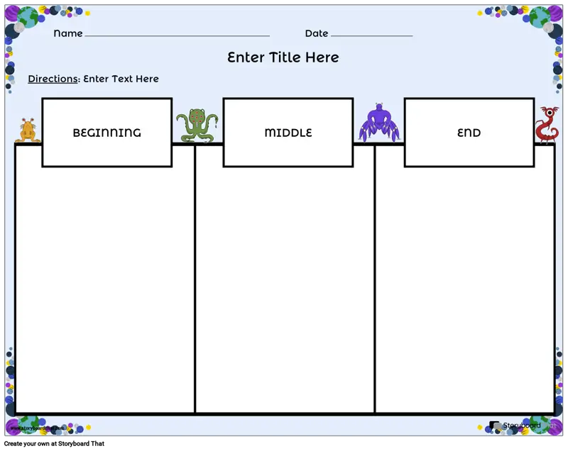Predložak početka, sredine i kraja na temu svemira i vanzemaljaca. Pejzažni raspored i u boji.