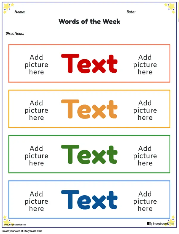Učenici sami prepoznaju svoje "riječi tjedna" (izazovne riječi koje su im nove) ili učitelji mogu sami uvesti nove riječi. Ovaj radni list može se prilagoditi novim riječima, kao i umjetninama koje predstavljaju svaku od njih. Radni listovi se mogu ispisati, izrezati i objesiti po sobi ili pohraniti kao flash kartice za laku referencu!