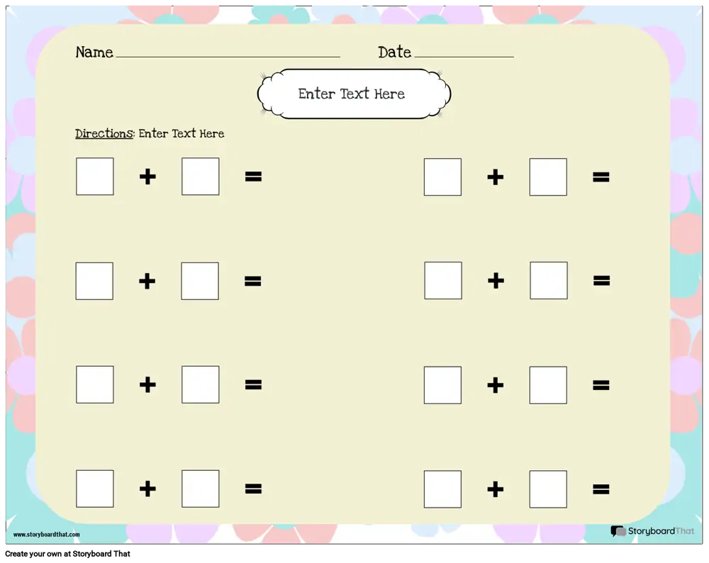 Radni listovi za zbrajanje savršeni su alati za vježbanje činjenica o zbrajanju i kompliciranijih jednadžbi. Pejzažni raspored, cvjetna tema, sa svijetlim bojama.