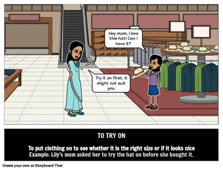 TO TRY ONTo put clothing on to see whether it is the right size or if it looks niceExample: Lily's mom asked her to try the hat on before she bought it.