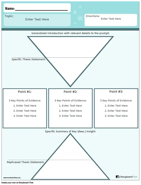 Napravite esej od 5 odlomaka/radne listove s dugim sastavom koji će pomoći učenicima organizirati informacije o njihovoj temi prije nego što počnu pisati!