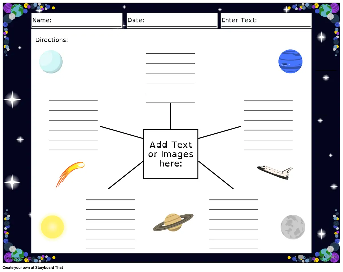 Radni list Spider Map s 5 žbica. Svemirska tema. Linije za pisanje.