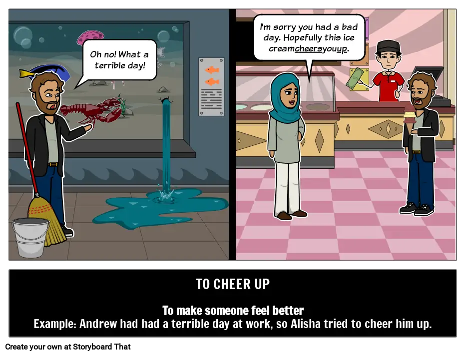 TO CHEER UPTo make someone feel betterExample: Andrew had had a terrible day at work, so Alisha tried to cheer him up.