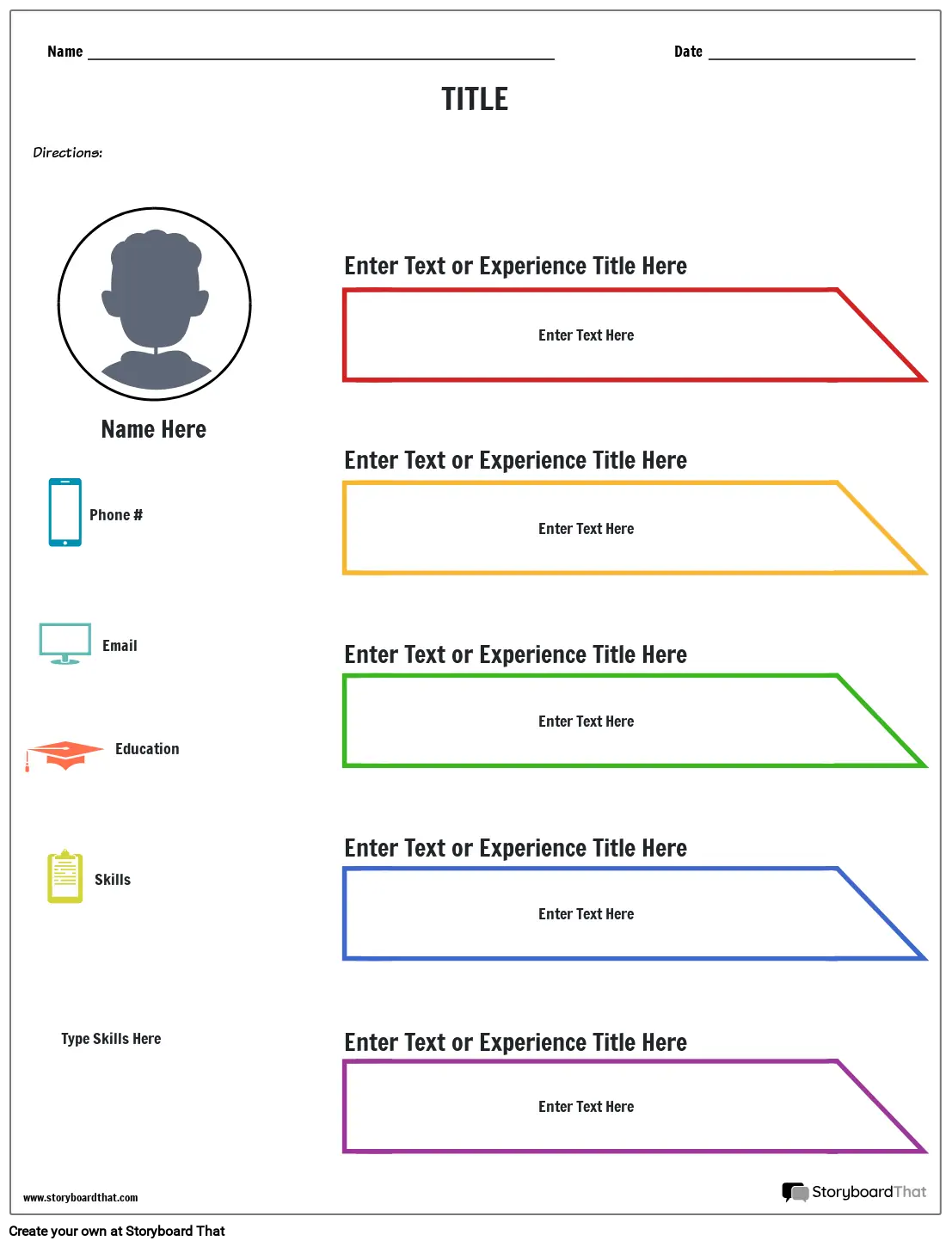 Radni listovi životopisa Storyboard That osmišljeni su da vode vaše studente u učinkovitom predstavljanju njihovih kvalifikacija. Svaki predložak slijedi profesionalni format životopisa koji studentima pomaže organizirati svoje informacije na način koji je lak za čitanje i probavu. Ova struktura osigurava da potencijalni poslodavci mogu brzo pronaći informacije koje su im potrebne prilikom pregledavanja prijave za posao.