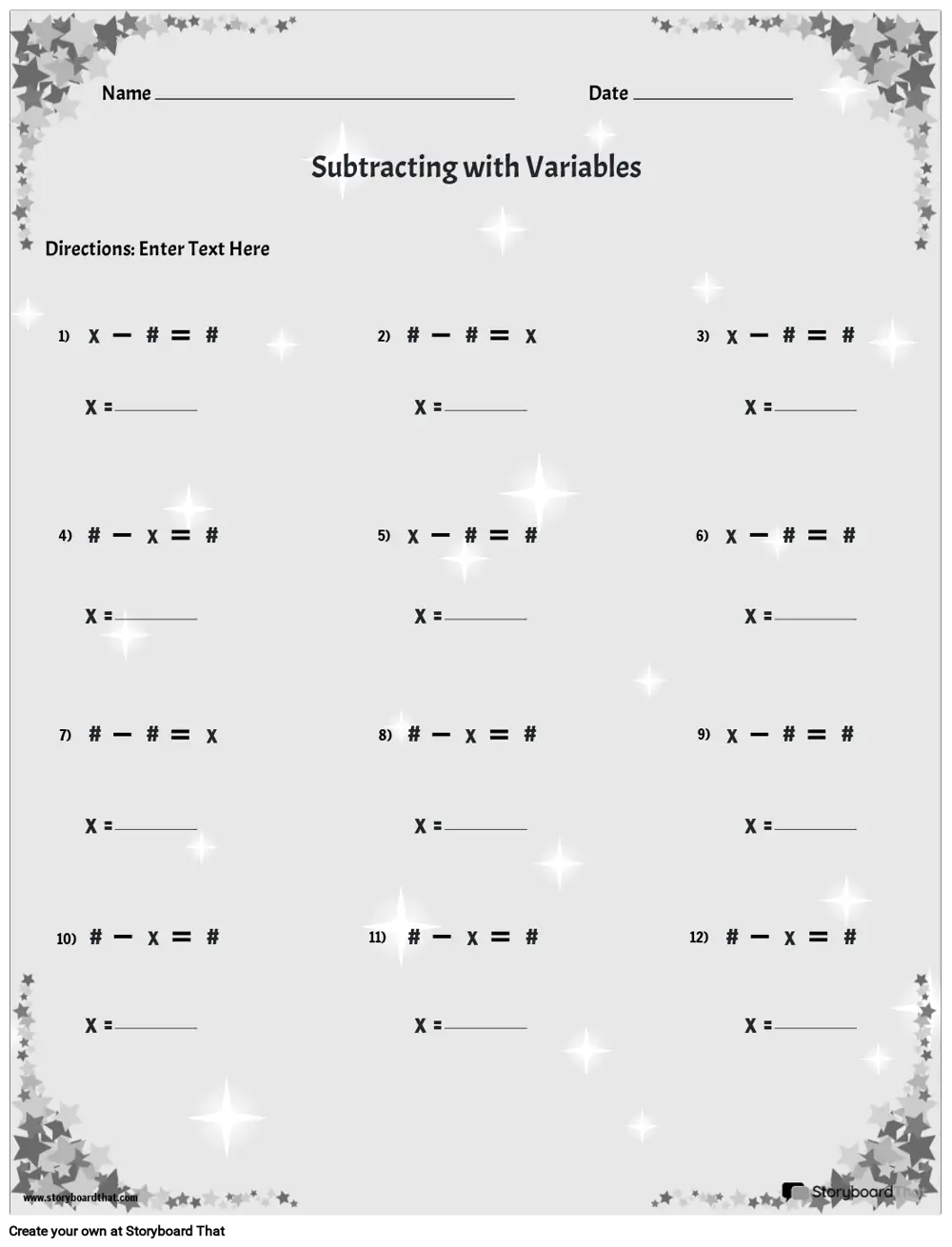 Değişkenlerle çıkarma alıştırması çalışma sayfası. 12 soru.